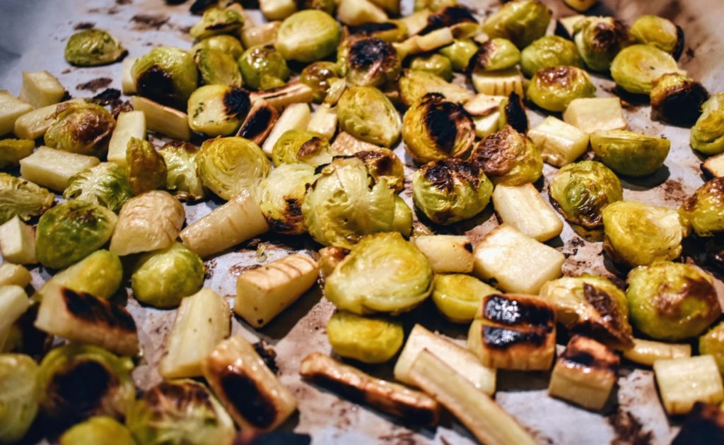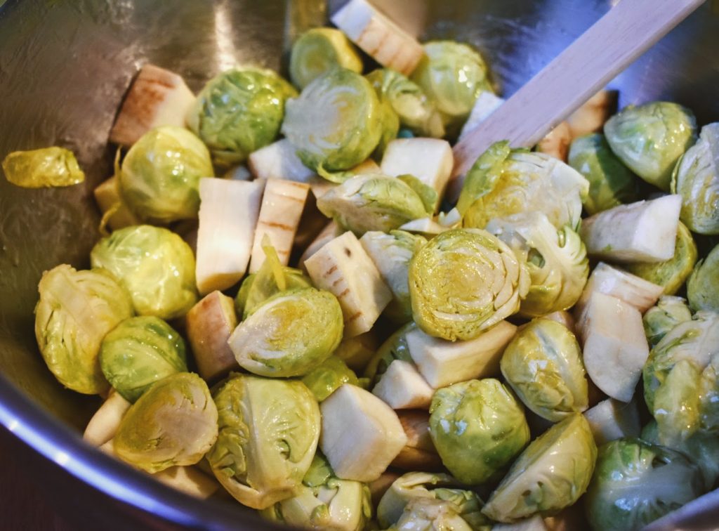 Toss brussel sprouts and parsnips together with a few tbsp of olive oil and salt. Spread on a baking sheet and put in oven for 15 minutes or until the sprouts have a nice char to them. Toss back into original bowl when finished.