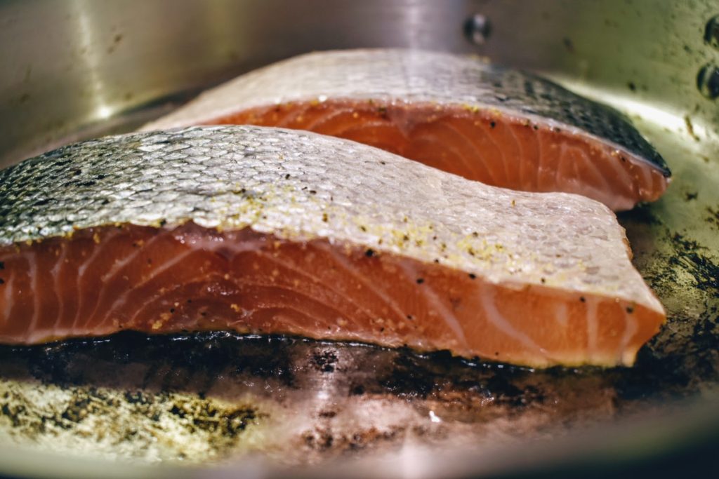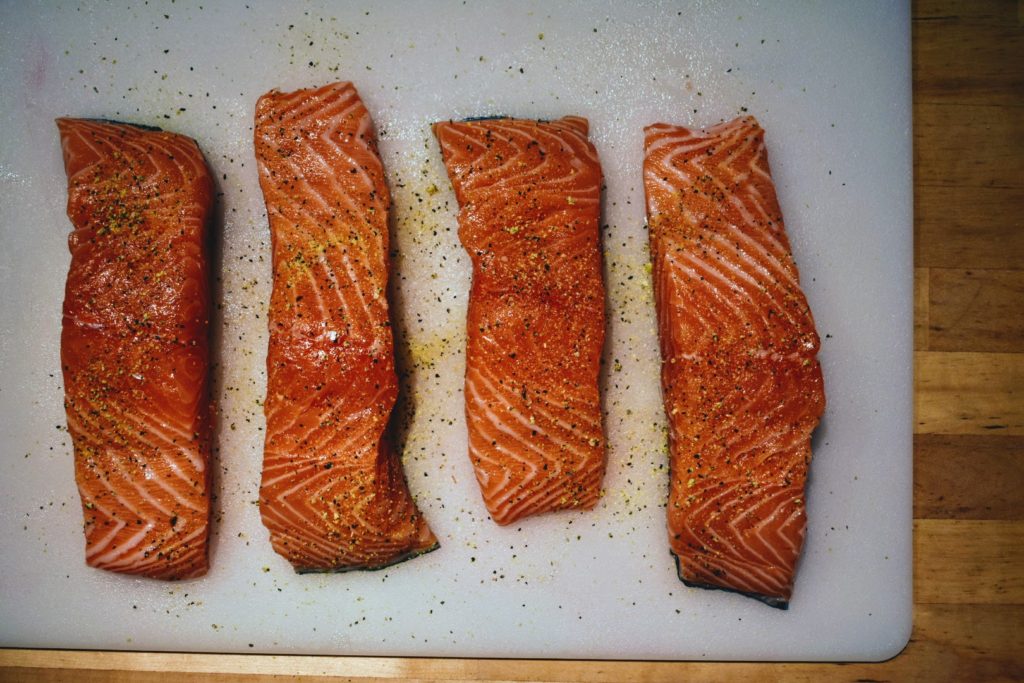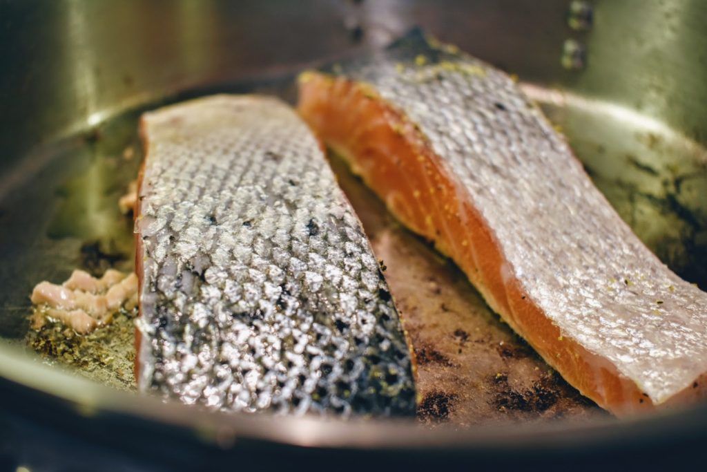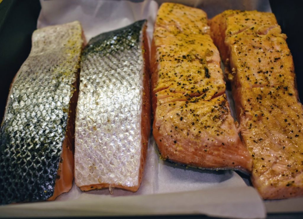Add another tbsp of olive oil and turn up the heat. Season the fish with lemon pepper. Add salmon with flesh side down to the pan, two filets at a time, and sear for one minute. Transfer to baking dish (I tried skin down and skin up but didn’t notice a difference). Bake until just before finished, about 10 minutes (I added my salmon during the last ten minutes of my brussel sprouts). Turn off the heat and let the fish rest for 2 minutes.